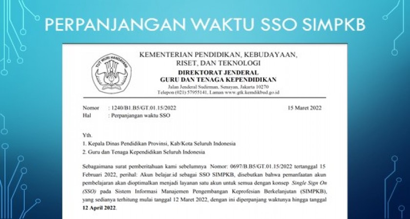 1. Sebagaimana surat pemberitahuan kami sebelumnya Nomor: 0697/B.B5/GT.01.15/2022 tertanggal 15 Februari 2022, perihal: Akun belajar.id sebagai SSO SIMPKB, disebutkan bahwa pemanfaatan akun pembelajaran akan dioptimalkan menjadi layanan satu akun untuk semua dengan konsep Single Sign On (SSO) pada Sistem Informasi Manajemen Pengembangan Keprofesian Berkelanjutan (SIMPKB), yang sedianya terhitung mulai tanggal 12 Maret 2022, dengan ini diperpanjang waktunya hingga tanggal 12 April 2022.