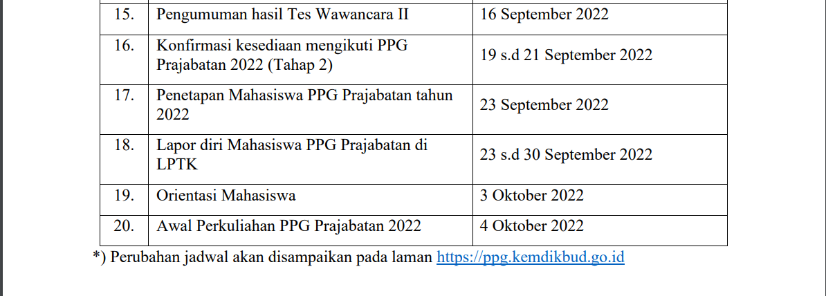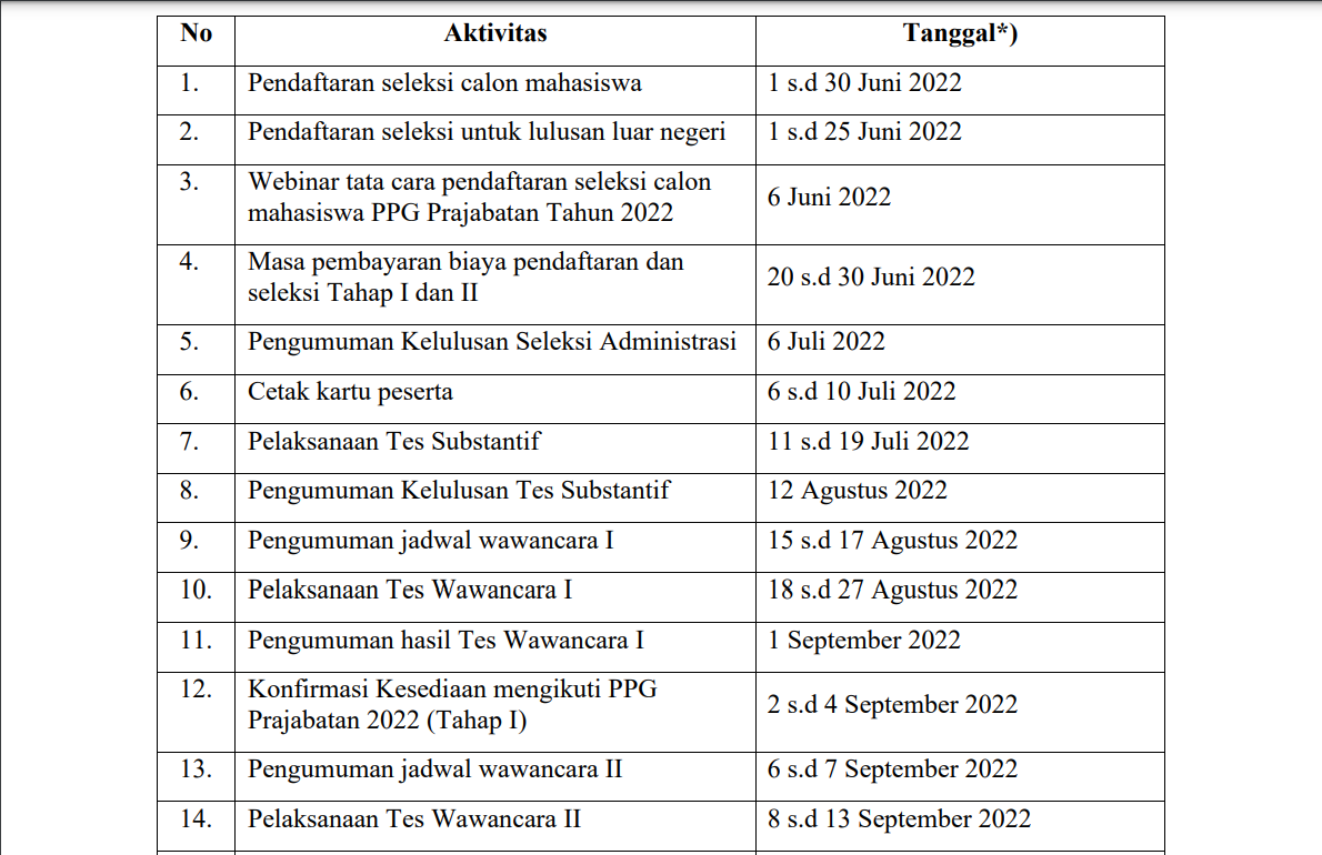Berdasarkan Pengumuman dari Kementerian Pendidikan Kebudayaan, Riset dan Teknologi, Direktorat Jenderal Guru dan Tenaga Kependidikan Nomor: 2518/B/GT.00.03/2022 tanggal 1 Juni 2022, disampaikan bahwa Direktorat Jenderal Guru dan Tenaga Kependidikan (Ditjen GTK), Kementerian Pendidikan, Kebudayaan, Riset, dan Teknologi mengundang Putra/Putri terbaik bangsa yang memiliki minat, bakat, dan panggilan jiwa menjadi guru untuk mengikuti seleksi calon Mahasiswa Program Pendidikan Profesi Guru (PPG) Prajabatan Tahun 2022, dengan ketentuan diantaranya sebagai berikut: