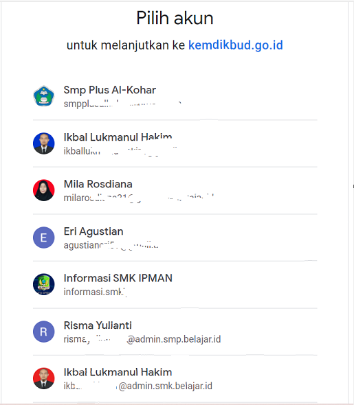 2. Silahkan klik tombol berwarna biru, Masuk sebagai Satuan/Dinas Pendidikan, Masuk dengan akun belajar.id. Kemudian pilih atau masuk dengan akun belajar.id Kepala Sekolah atau Tenaga Administrasi Sekolah, yang berakhiran @admin.smk.belajar.id, @admin.smp.belajar.id atau @admin.sd.belajar.id.