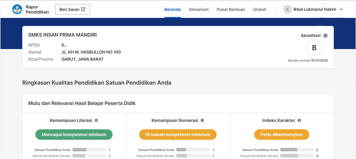 4. Di beranda akan ditampilkan Ringkasan Kualitas Satuan Pendidikan masing-masing meliputi:
