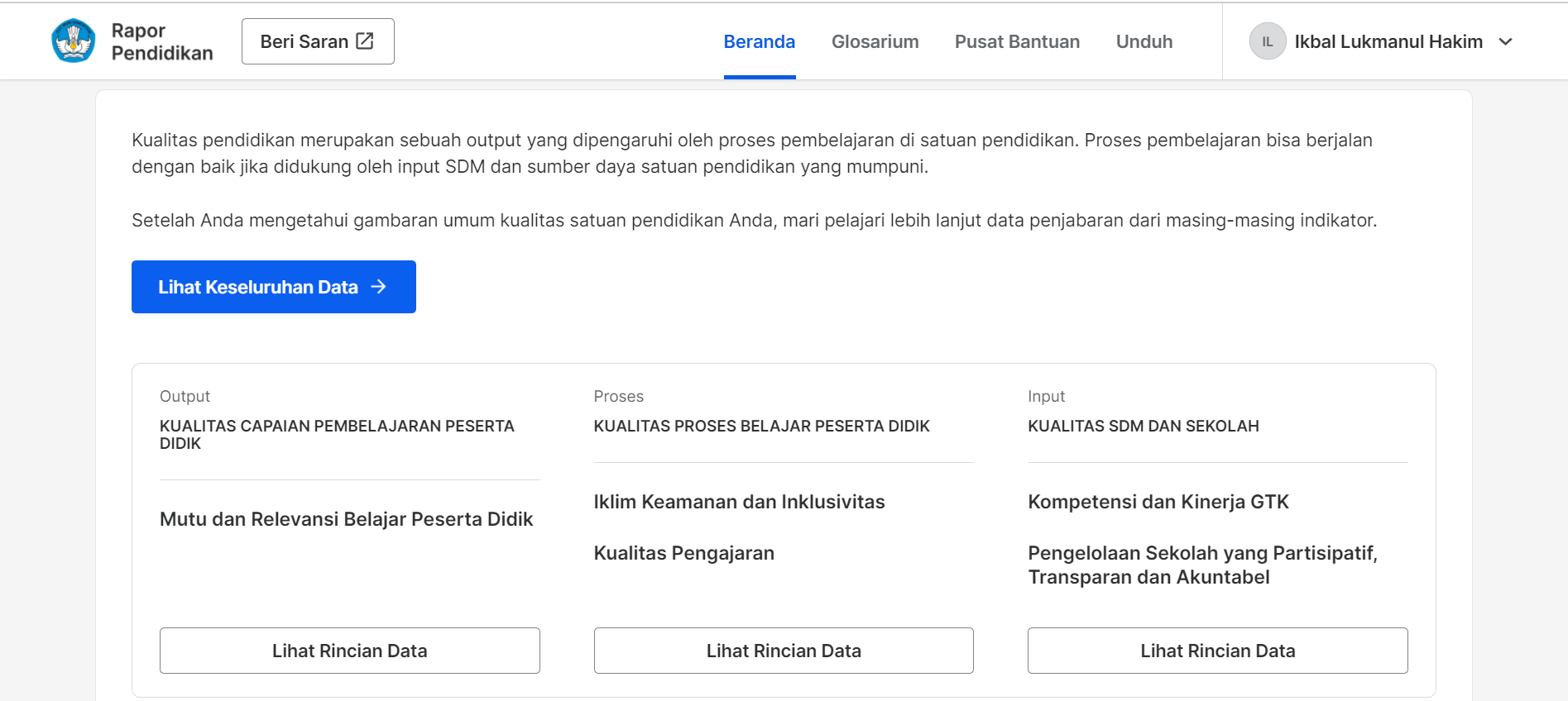 6. Setelah klik tombol Lihat Keseluruhan Data, maka akan ditampilkan data Rapor Pendidikan secara rinci, sehingga data tersebut bisa dijadikan dasar Satuan Pendidikan untuk meningkatkan atau mengevaluasi Mutu Hasil Belajar, Mutu Pembelajaran, Kompetensi dan Kinerja GTK serta Pengelolaan Sekolah yang Partisipatif, Transparan, dan Akuntabel.