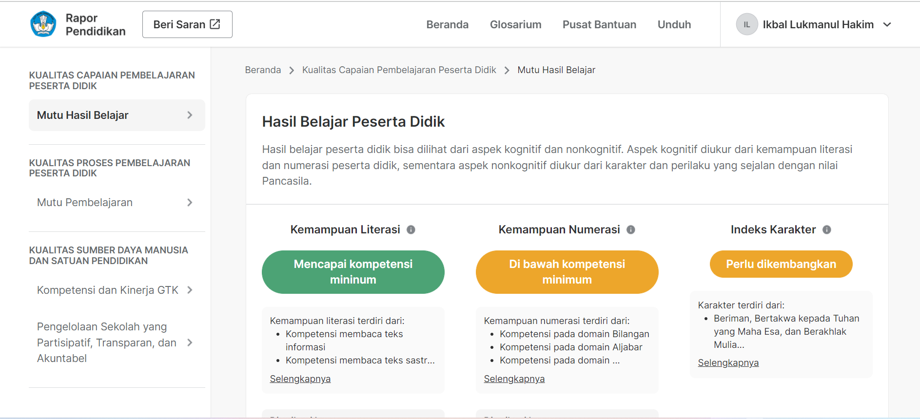 a. Mutu dan Relevansi Hasil Belajar Peserta Didik, berupa Kemampuan Literasi, Kemampuan Numerasi, dan Indeks Karakter;