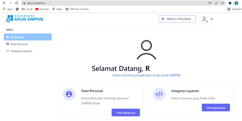 11. Jika berhasil, maka akan langsung diarahkan ke Beranda akun SIMPKB.
