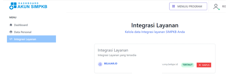 7. Jika sebelumnya akun belajar.id sudah login, maka akan langsung diarahkan kembali ke menu Integrasi Layanan, dengan muncul keterangan TERTAUT, dan di sampingnya tampil akun belajar.id yang ditautkan. Jika ingin mentautkan dengan akun belajar.id yang lain, karena memiliki akun belajar.id lebih dari satu, silahkan klik tombol HAPUS terlebih dahulu, dan ulangi Langkah 1-6 atau minimal ulangi dari Langkah 5-6;